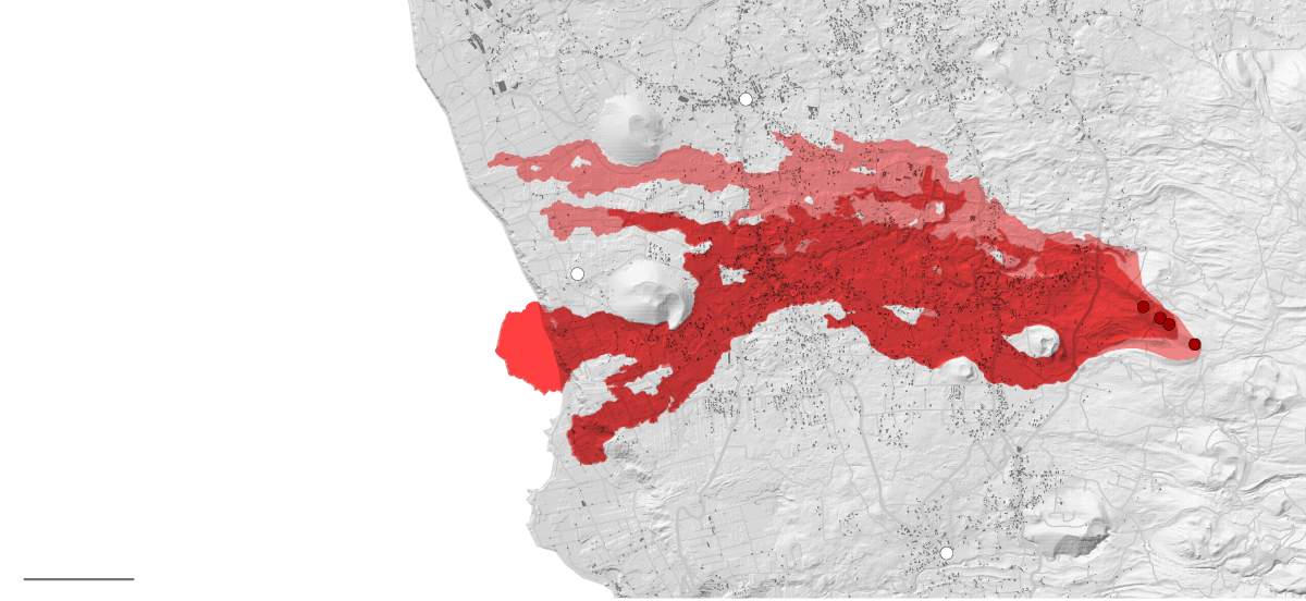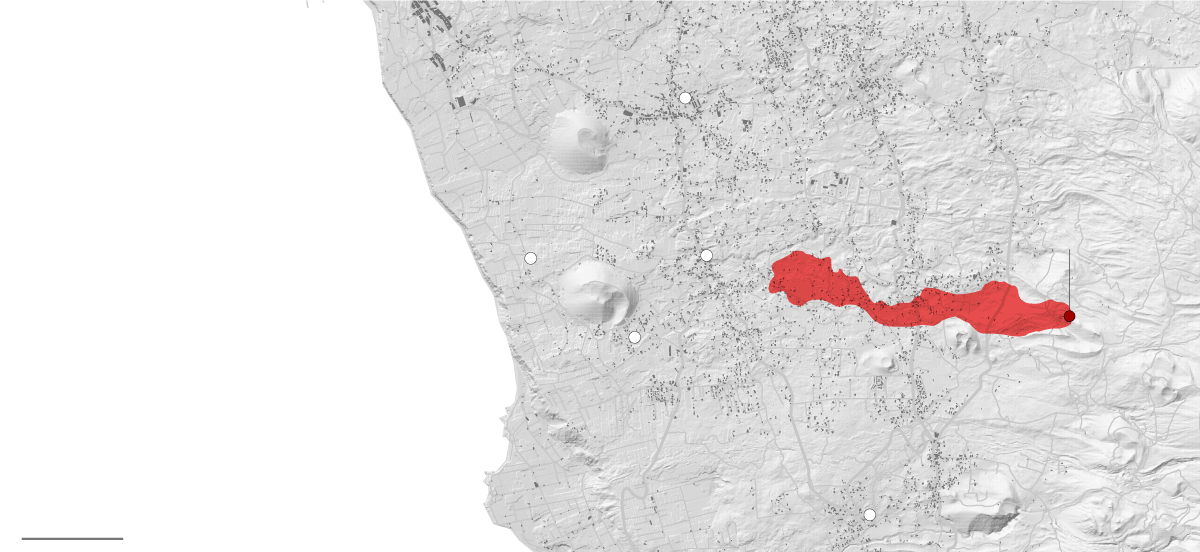 A ferocidade da língua de lava que brota do subsolo não tarda a arrasar as primeiras localidades. As autoridades prosseguem com as desocupações, e a cifra ao final da primeira jornada ascenderia a 5.600 desabrigados. Atualmente, são mais de 7.000 pessoas.