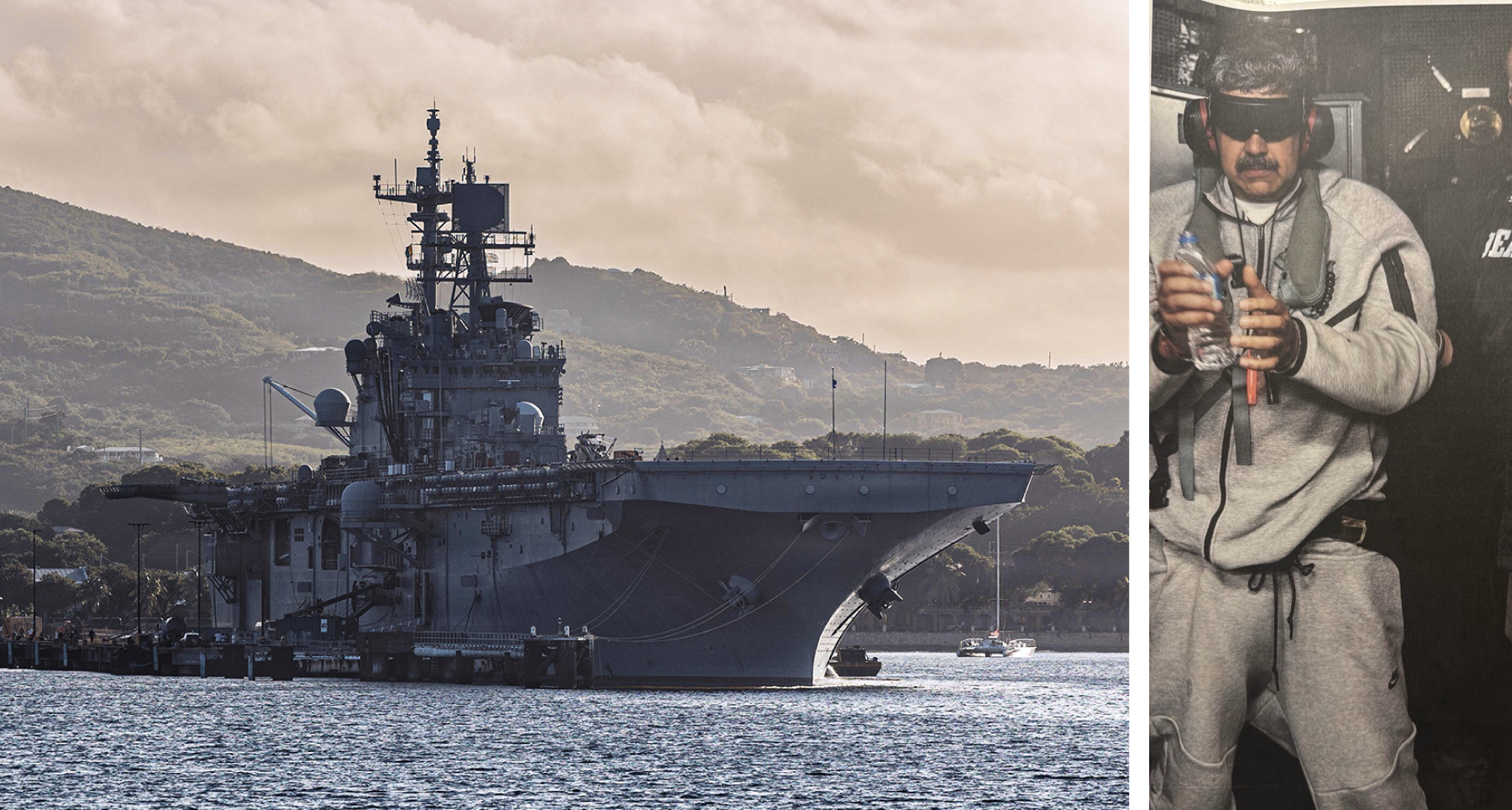 Navio USS Iwo Jima (Marinha dos EUA via AP) e foto de Maduro publicada por Trump nas redes sociais.